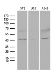 - Western blot analysis of extracts (35 µg) from 3 different cell lines by using anti-HOXC4 monoclonal antibody. (1:500)