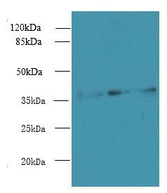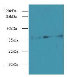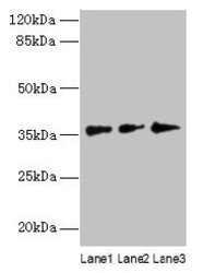 - Western blot. All lanes: LDAH antibody at 8 ug/ml. Lane 1: HeLa whole cell lysate. Lane 2: Jurkat whole cell lysate. Lane 3: A431 whole cell lysate. Secondary Goat polyclonal to Rabbit IgG at 1:10000 dilution. Predicted band size: 37 kDa. Observed band size: 37 kDa.
