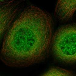 - Immunofluorescent staining of C2orf43 in human cell line A-431 shows positivity in cytoplasm & nucleus but excluded from the nucleoli. Samples were probed using a C2orf43 Polyclonal Antibody (Product # PA5-57034).