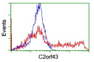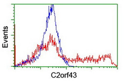 - HEK293T cells transfected with either RC203367 overexpress plasmid(Red) or empty vector control plasmid(Blue) were immunostained by anti-C2orf43 antibody(TA504833), and then analyzed by flow cytometry.