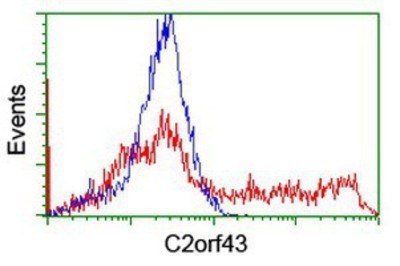 - Flow Cytometry: C2orf43 Antibody (2G9) [NBP2-03718] - HEK293T cells transfected with either overexpression plasmid (Red) or empty vector control plasmid (Blue) were immunostained by anti-C2orf43 antibody, and then analyzed by flow cytometry.