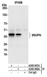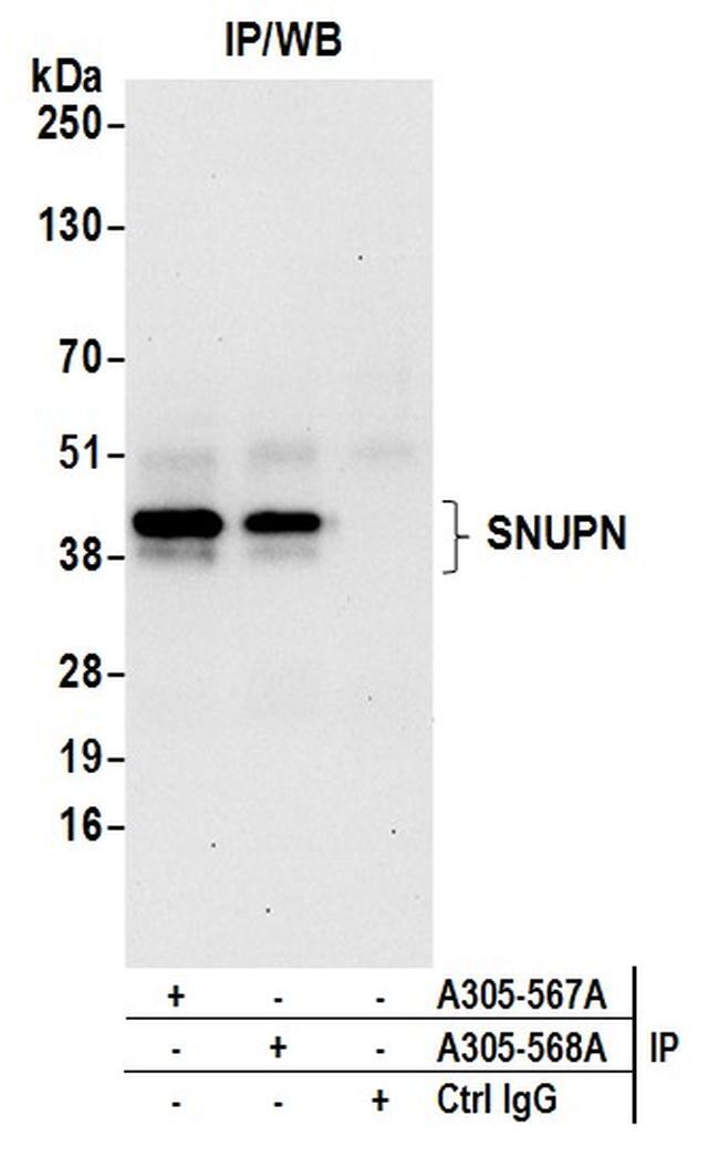 - Detection of human SNUPN by western blot of immunoprecipitates. Samples: Whole cell lysate (0.5 or 1.0 mg per IP reaction; 20% of IP loaded) from 293T cells prepared using NETN lysis buffer. Antibodies: Affinity purified rabbit anti-SNUPN antibody A305-568A (lot A305-568A-1) used for IP at 6 µg per reaction. SNUPN was also immunoprecipitated by rabbit anti-SNUPN antibody A305-567A. For blotting immunoprecipitated SNUPN, A305-568A was used at 0.4 µg/ml. Detection: Chemiluminescence with an exposure time of 30 seconds.