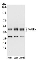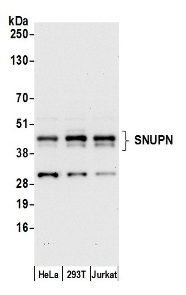 - Detection of human SNUPN by western blot. Samples: Whole cell lysate (15 µg) from HeLa, 293T, and Jurkat cells prepared using NETN lysis buffer. Antibody: Affinity purified rabbit anti-SNUPN antibody A305-568A (lot A305-568A-1) used for WB at 0.1 µg/ml. Detection: Chemiluminescence with an exposure time of 30 seconds.