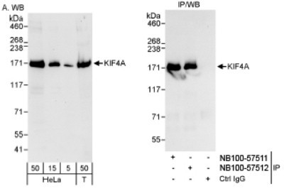 - Western Blot: Kif4A Antibody [NB100-57512] - Detection of Human KIF4A on HeLa whole cell lysate using NB100-57512. KIF4A was also immunoprecipitated by rabbit anti-KIF4A antibody NB100-57511.