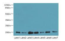 - Western blot. All lanes: COPZ1 antibody at 1 ug/ml. Lane 1: HeLa whole cell lysate. Lane 2: NIH/3T3 whole cell lysate. Lane 3: RAW 264.7 whole cell lysate. Lane 4: Jurkat whole cell lysate. Lane 5: Mouse liver tissue. Lane 6: Mouse kidney tissue. Lane 7: K562 whole cell lysate. Secondary Goat polyclonal to Rabbit IgG at 1:10000 dilution. Predicted band size: 20 kDa. Observed band size: 20 kDa.