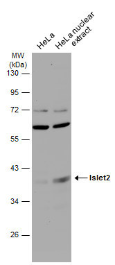 - HeLa whole cell and nuclear extracts (30 ?g) were separated by 10% SDS-PAGE, and the membrane was blotted with Islet2 antibody (GTX129375) diluted at 1:500. The HRP-conjugated anti-rabbit IgG antibody (GTX213110-01) was used to detect the primary antibody.