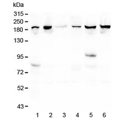 - Western blot testing of human 1) placenta, 2) T-47D, 3) U-2 OS, 4) K562, 5) ThP-1 and 6) monkey COS-7 lysate with CPAMD8 antibody at 0.5ug/ml. Predicted molecular weight ~207 kDa.
