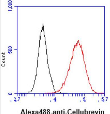 - Flow Cytometry: VAMP3/Cellubrevin Antibody (4G9) [NBP1-97948] - Analysis of Cellubrevin in HeLa cell line, staining at 2-5ug for 1x106cells (red line). The secondary antibody used goat anti-mouse IgG Alexa fluor 488 conjugate. Isotype control antibody was mouse IgG (black line)