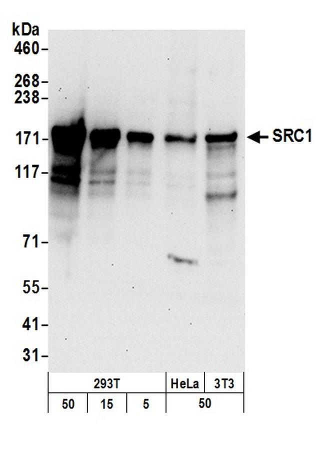 - Detection of human and mouse SRC1 by western blot. Samples: Whole cell lysate from 293T (50, 15, 5 µg), and (50 µg) from HeLa, and mouse NIH3T3 cells prepared using NETN lysis buffer. Antibody: Affinity purified rabbit anti-SRC1 antibody A300-343A-M (lot A300-343A-M-2) used at 1:1000. Detection: Chemiluminescence with an exposure time of 30 seconds.