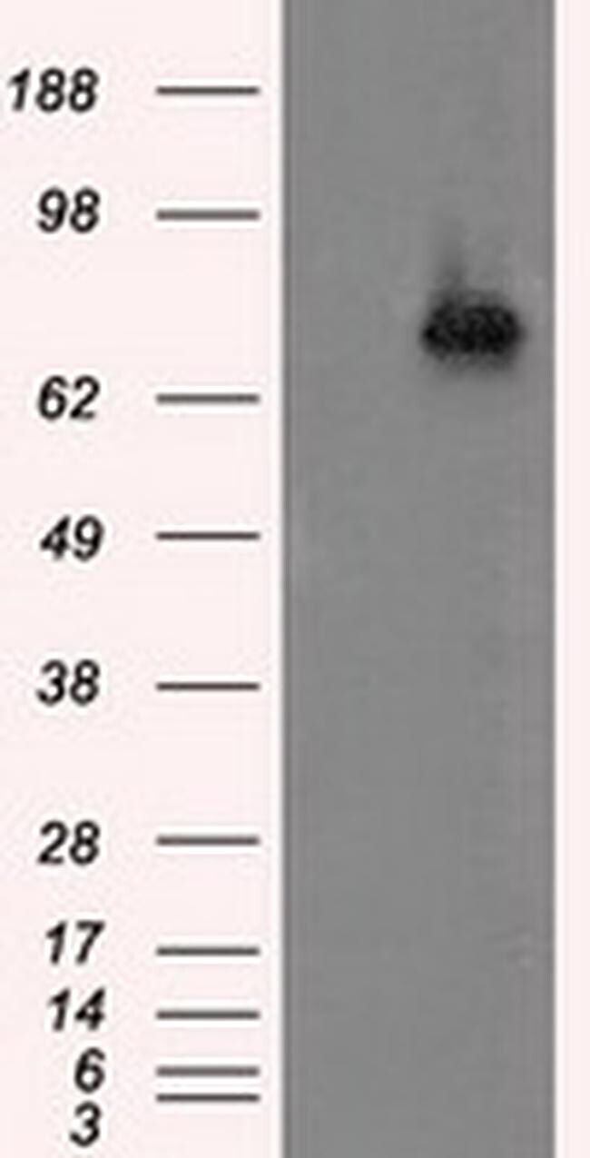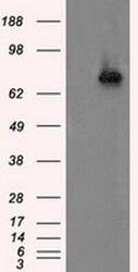 - HEK293T cells were transfected with the pCMV6-ENTRY control (Left lane) or pCMV6-ENTRY ACSBG1 (RC203219, Right lane) cDNA for 48 hrs and lysed. Equivalent amounts of cell lysates (5 µg per lane) were separated by SDS-PAGE and immunoblotted with anti-ACSBG. Positive lysates LY414754 (100 µg) and LC414754 (20 µg) can be purchased separately from OriGene.