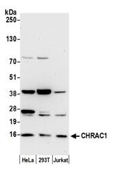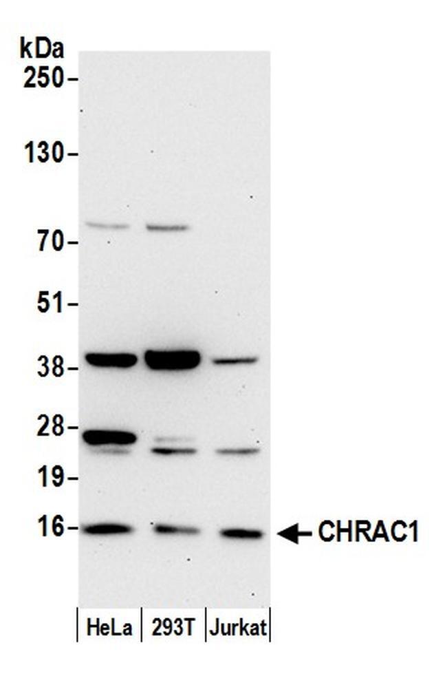 - Detection of human CHRAC1 by western blot. Samples: Whole cell lysate (25 µg) from HeLa, 293T, and Jurkat cells prepared using NETN lysis buffer. Antibody: Affinity purified rabbit anti-CHRAC1 antibody A304-987A (lot A304-987A-1) used for WB at 0.4 µg/ml. Detection: Chemiluminescence with an exposure time of 60 seconds.