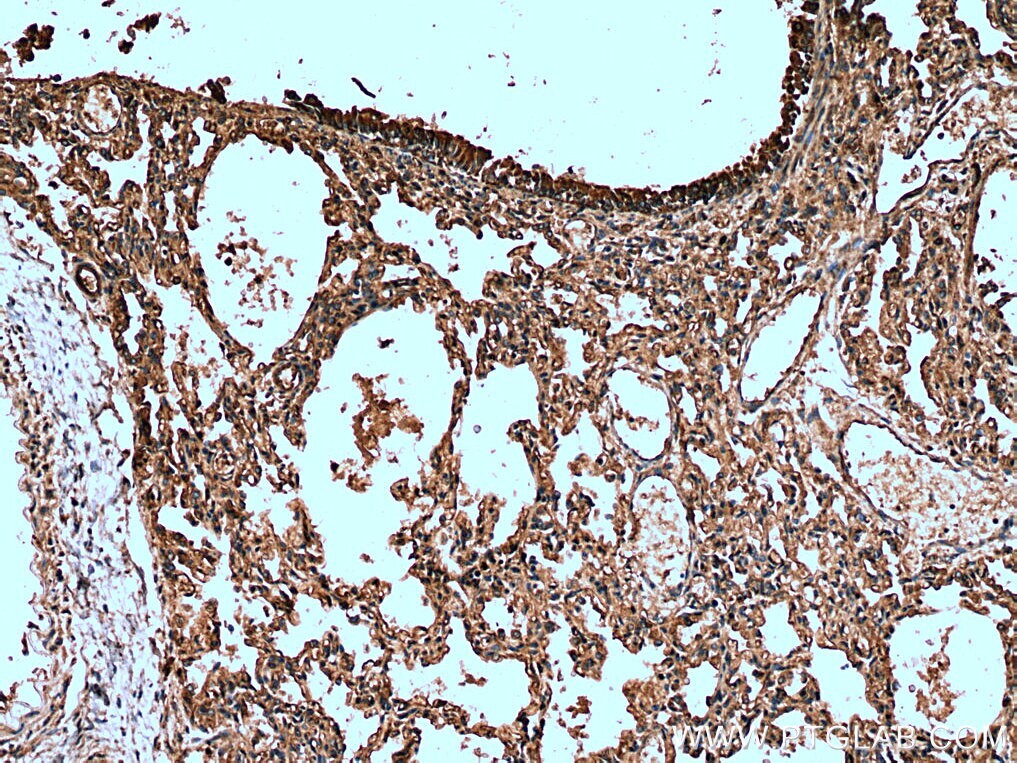 - Immunohistochemical analysis of paraffin-embedded human lung tissue slide using 26228-1-AP (SCGB3A2 antibody) at dilution of 1:200 (under 10x lens). Heat mediated antigen retrieval with Tris-EDTA buffer (pH 9.0).