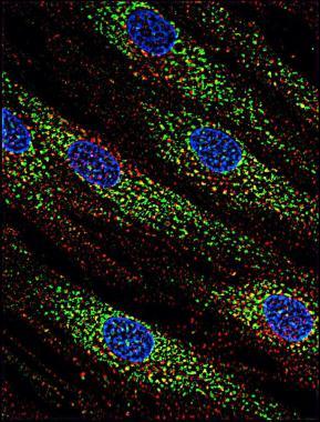 - Immunofluorescence staining of human skin fibroblasts with anti-CD63 (MEM-259 (GTX28219); green) after co-incubation of living cells with human Transferrin - Dyomics 547 (red); cell nuclei stained with DAPI (blue).