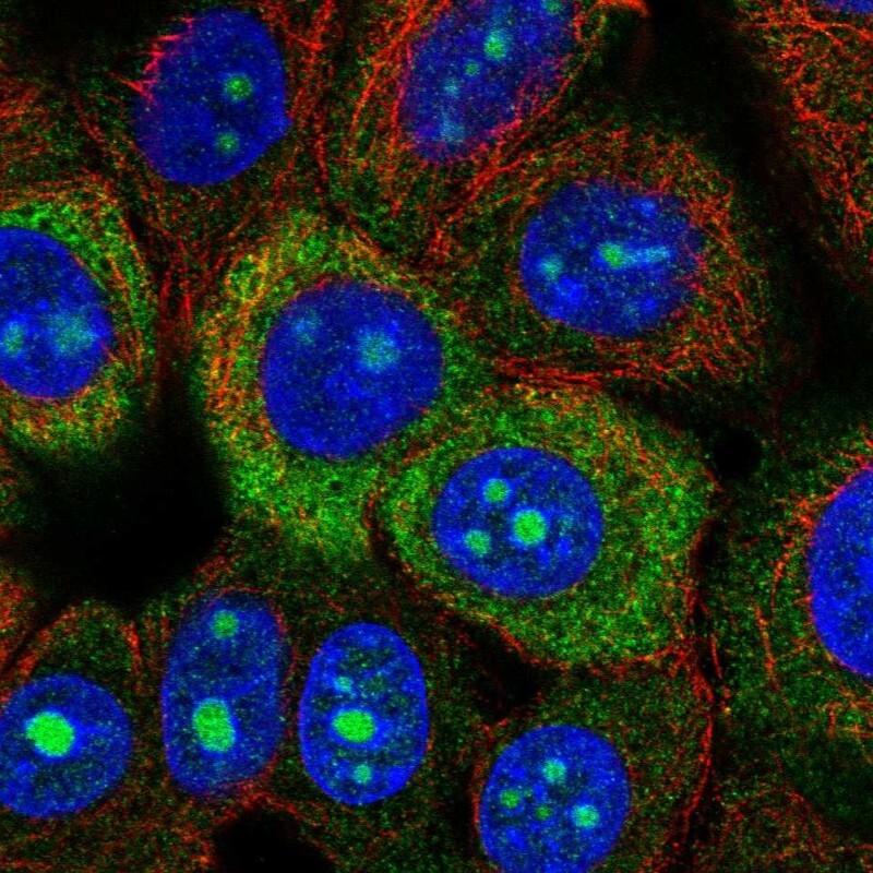 - Immunofluorescent staining of human cell line MCF7 shows localization to nucleoli, cytosol & endoplasmic reticulum.