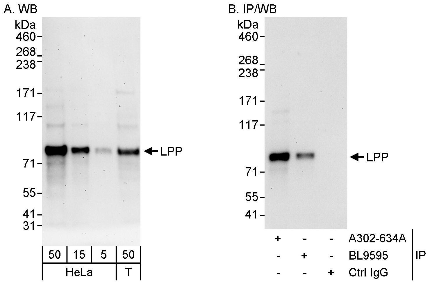 - Detection of human LPP by western blot and immunoprecipitation. Samples: Whole cell lysate from HeLa (5, 15 and 50 µg for WB; 1 mg for IP, 20% of IP loaded) and 293T (T; 50 µg) cells. Antibodies: Affinity purified rabbit anti-LPP antibody A302-634A used for WB at 0.04 µg/ml (A) and 0.4 µg/ml (B) and used for IP at 3 µg/mg lysate. LPP was also immunoprecipitated by rabbit anti-LPP antibody BL9595, which recognizes a downstream epitope. Detection: Chemiluminescence with exposure times of 3 minutes (A) and 30 seconds (B).