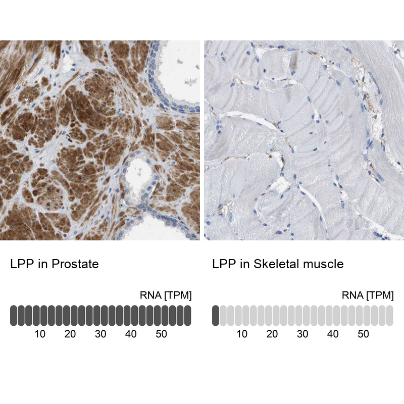 - Immunohistochemistry analysis in human prostate and skeletal muscle tissues using HPA017342 antibody. Corresponding LPP RNA-seq data are presented for the same tissues.