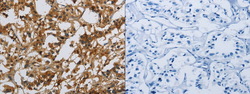 - The image on the left is immunohistochemistry of paraffin-embedded Human gastric cancer tissue using (CMTM8 Antibody) at dilution 1/40, on the right is treated with synthetic peptide. (Original magnification: ?200)