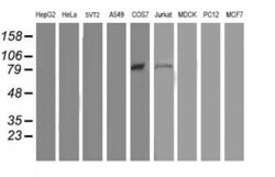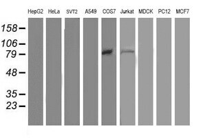 - Western blot analysis of extracts (35 µg) from 9 different cell lines by using anti-OSBP monoclonal antibody.
