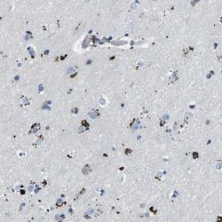 - Immunohistochemical staining of human cerebral cortex shows granular cytoplasmic positivity in neuronal cells.