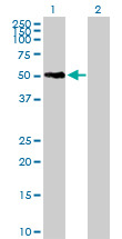 - Western Blot analysis of SNX21 expression in transfected 293T cell line (H00090203-T02) by SNX21 MaxPab polyclonal antibody.Lane 1: SNX21 transfected lysate(41.03 KDa).Lane 2: Non-transfected lysate.