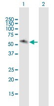 - Western Blot analysis of JRK expression in transfected 293T cell line (H00008629-T01) by JRK MaxPab polyclonal antibody.Lane 1: JRK transfected lysate(62.48 KDa).Lane 2: Non-transfected lysate.