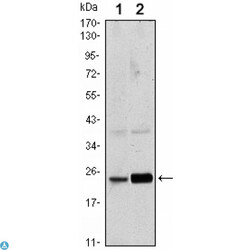 - Western Blot (WB) analysis using Rab 10 Monoclonal Antibody against HeLa (1) and NIH/3T3 (2) cell lysate.