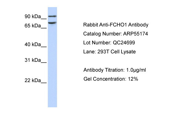 - Western blot analysis using Anti-FCHO1 antibody detects protein at predicted molecular weight using Transfected 293T Cells as a positive control. Tissue/Lysate Concentration: 1ug/ml Antibody Concentration: 1.0ug/ml
