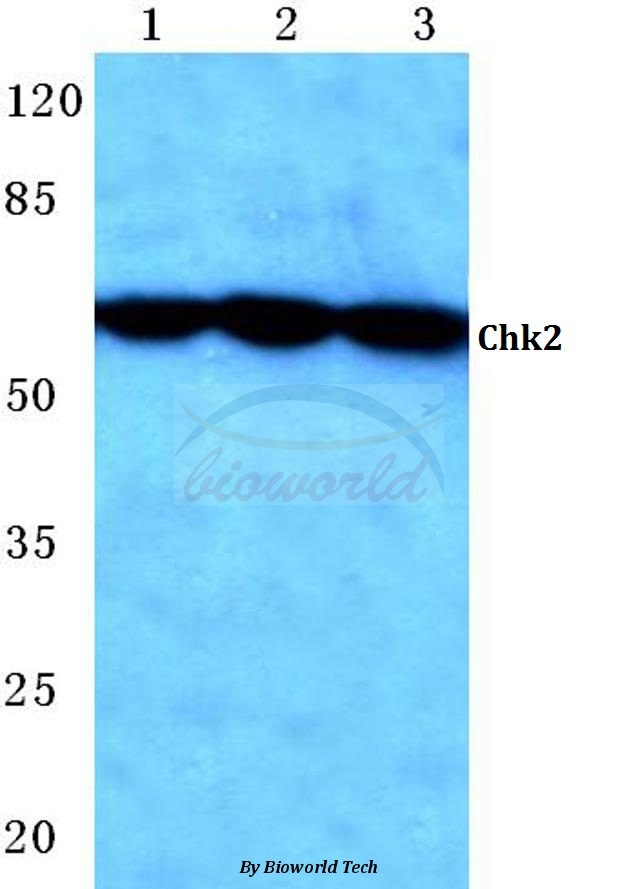 - Western blot (WB) analysis of Chk2 (S62) pAb at 1:500 dilutionLane1:MCF-7 cell lysateLane2:Mouse liver tissue lysateLane3:Rat liver tissue lysate