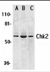 - Western blot: (A) K562, (B) Jurkat, and (C) HL-60 whole cell lysates stained with ARG54652 anti-Chk2 antibody at 1 µg /ml.