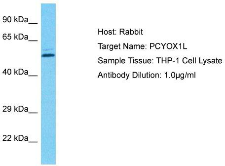 - Host: Rabbit; Target Name: PCYOX1L; Sample Tissue: THP-1 Whole Cell lysates; Antibody Dilution: 1.0ug/ml