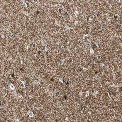 - Immunohistochemical staining of human cerebral cortex shows distinct cytoplasmic positivity in glial cells and neuropil.