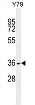 - ZFP41 Antibody (N-term) (AP54645PU-N) western blot analysis in Y79 cell line lysates (35 µg/lane). This demonstrates the ZFP41 antibody detected the ZFP41 protein (arrow).