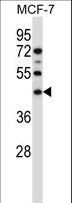 - SGMS1 Antibody western blot of MCF-7 cell line lysates (35 ug/lane). The SGMS1 antibody detected the SGMS1 protein (arrow).