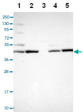 - Western blot analysis of Lane 1: RT-4 Lane 2: U-251 MG Lane 3: Human Plasma Lane 4: Liver Lane 5: Tonsil with SGMS1 polyclonal antibody (Cat # PAB28308).