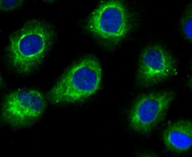- Immunocytochemical analysis of FBXL2 in A431 cells using a FBXL2 Polyclonal antibody (Product # PA5-86061) as seen in green. The nuclear counter stain is DAPI (blue). Cells were fixed in paraformaldehyde, permeabilised with 0.25% Triton X100/PBS.
