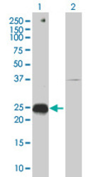 - Western Blot analysis of MS4A5 expression in transfected 293T cell line (H00064232-T01) by MS4A5 MaxPab polyclonal antibody.Lane 1: MS4A5 transfected lysate(22.11 KDa).Lane 2: Non-transfected lysate.