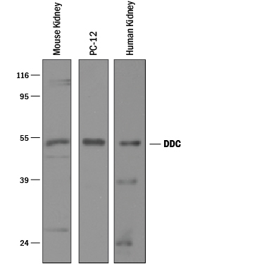 - Detection of Human, Mouse, and Rat Dopa Decarboxylase/DDC by Western Blot. Western blot shows lysates of mouse kidney tissue, PC-12 rat adrenal pheochromocytoma cell line, and human kidney tissue. PVDF membrane was probed with 1 µg/mL of Goat Anti-Human/Mouse/Rat Dopa Decarboxylase/DDC Antigen Affinity-purified Polyclonal Antibody (Catalog # AF3564) followed by HRP-conjugated Anti-Goat IgG Secondary Antibody (Catalog # HAF109). A specific band was detected for Dopa Decarboxylase/DDC at approximately 54 kDa (as indicated). This experiment was conducted under reducing conditions and using Immunoblot Buffer Group 1.