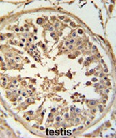 - ABCF1 Antibody (C-term) (Cat. #AP50022PU-N) IHC analysis in formalin fixed and paraffin embedded human testis tissue followed by peroxidase conjugation of the secondary antibody and DAB staining. This data demonstrates the use of the ABCF1 Antibody (C-term) for immunohistochemistry. Clinical relevance has not been evaluated.