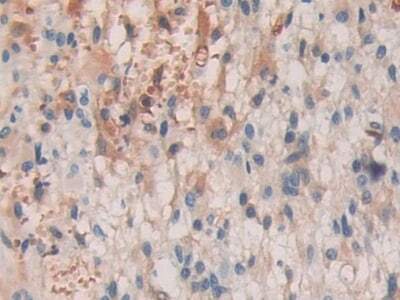 - Immunohistochemistry analysis of SHC3 in paraffin-embedded Human Glioma tissue. Samples were incubated with polyclonal antibody (Product # PA5-119411) at a dilution of 10 µg/mL, followed by HRP-Linked Caprine Anti-Rabbit IgG using a dilution of 2 µg/mL.