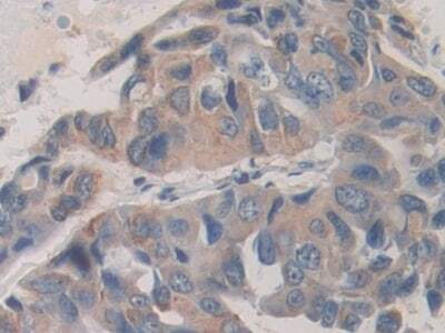 - Immunohistochemistry analysis of SHC3 in paraffin-embedded Human Breast cancer tissue. Samples were incubated with polyclonal antibody (Product # PA5-119411) at a dilution of 10 µg/mL, followed by HRP-Linked Caprine Anti-Rabbit IgG using a dilution of 2 µg/mL.
