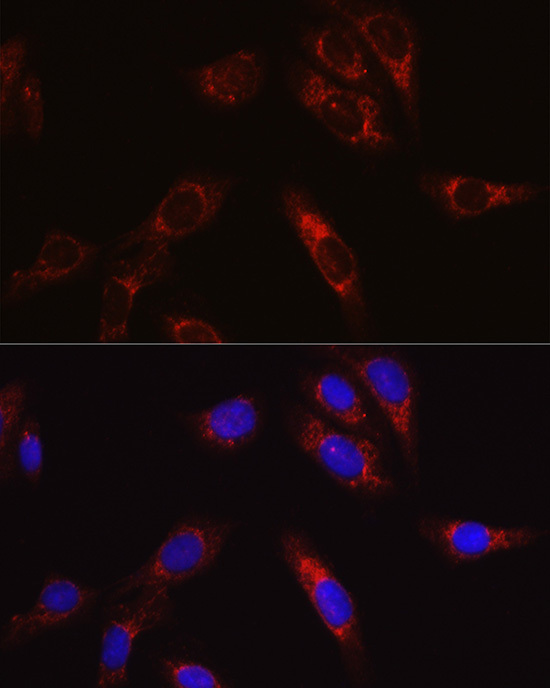 - Immunofluorescence analysis of HeLa cells using SECISBP2 rabbit polyclonal antibody (STJ28819) at dilution of 1:50 (40x lens). Blue: DAPI for nuclear staining.