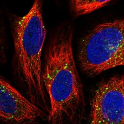 - Immunofluorescent staining of human cell line U-2 OS shows localization to endosomes & lysosomes.