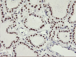 - IHC of paraffin-embedded Carcinoma of Human thyroid tissue using anti-OBFC2B mouse monoclonal antibody.