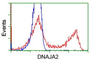 - HEK293T cells transfected with either RC202204 overexpress plasmid(Red) or empty vector control plasmid(Blue) were immunostained by anti-DNAJA2 antibody(TA501710), and then analyzed by flow cytometry.