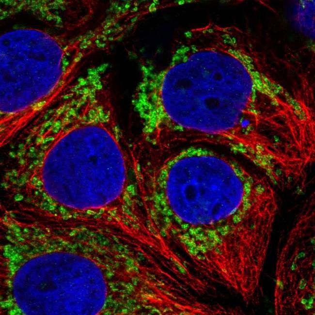 - Immunofluorescent staining of TMEM144 in human cell line CACO-2 shows localization to mitochondria. Samples were probed using a TMEM144 Polyclonal Antibody (Product # PA5-66597).