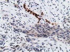 - Immunohistochemical staining of paraffin-embedded Adenocarcinoma of Human endometrium tissue using anti-EPM2AIP1 mouse monoclonal antibody. (Heat-induced epitope retrieval by 10mM citric buffer, pH6.0, 100°C for 10min, TA501797)
