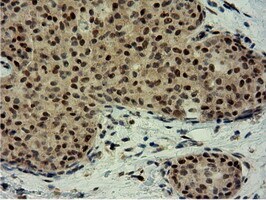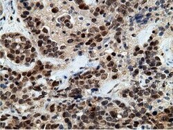 - Immunohistochemical staining of paraffin-embedded Adenocarcinoma of Human breast tissue using anti-EPM2AIP1 mouse monoclonal antibody. (Heat-induced epitope retrieval by 10mM citric buffer, pH6.0, 100°C for 10min, TA501797)