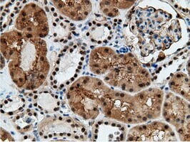 - Immunohistochemical staining of paraffin-embedded human Kidney tissue within the normal limits using anti-EPM2AIP1 mouse monoclonal antibody. (Heat-induced epitope retrieval by 10mM citric buffer, pH6.0, 100°C for 10min, TA501797)