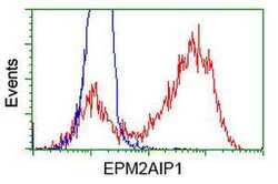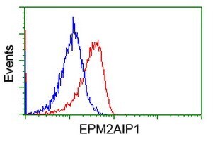 - HEK293T cells transfected with either RC209239 overexpress plasmid (Red) or empty vector control plasmid (Blue) were immunostained by anti-EPM2AIP1 antibody (TA501797), and then analyzed by flow cytometry.