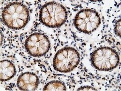 - Immunohistochemical staining of paraffin-embedded human colon tissue within the normal limits using anti-EPM2AIP1 mouse monoclonal antibody. (Heat-induced epitope retrieval by 10mM citric buffer, pH6.0, 100°C for 10min, TA501797)